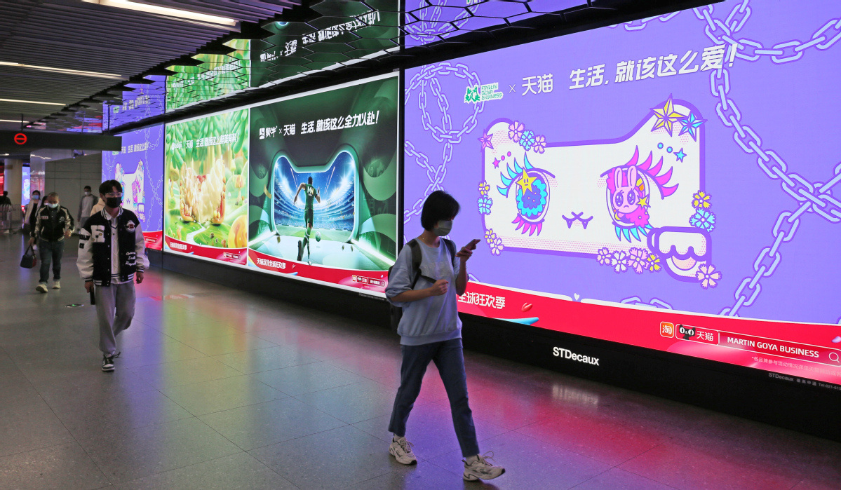Pedestrians walk past Singles Day advertisements of Tmall in Shanghai. CHEN YUYU/FOR CHINA DAILY
