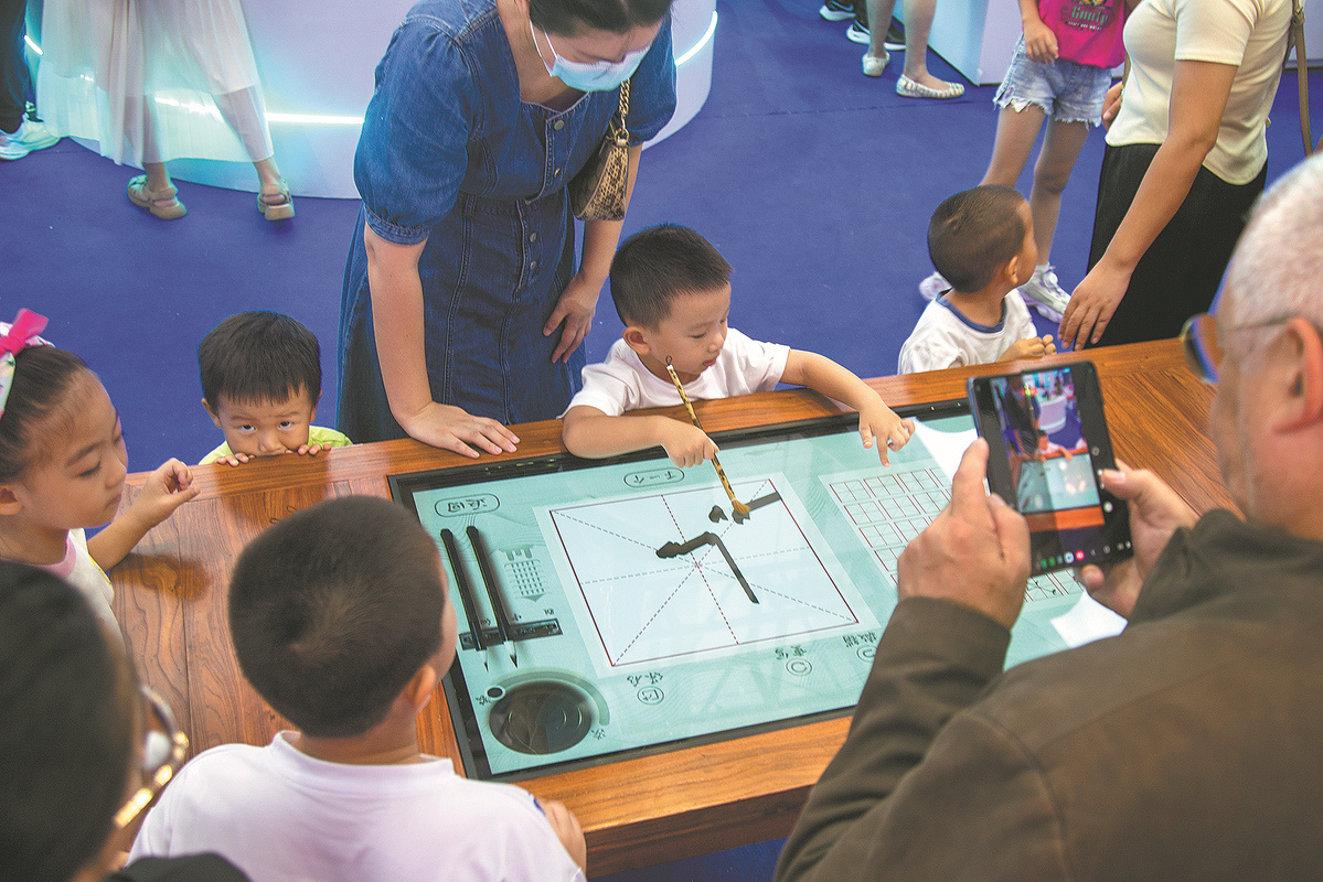 A child experiences writing with a Chinese calligraphy brush on a digital screen at the 14th China International Digital Publishing Expo in Hainan province on Saturday. [Photo provided to China Daily]