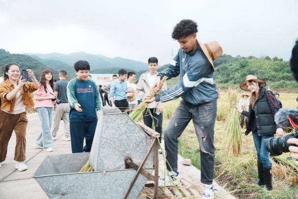 Throughout the day, participants engaged in various agricultural activities, immersing themselves in the spirit of rural life. In the rice-cutting competition, international students, with their pants rolled up, called for help and cheered each other on as they navigated the rice paddies. Additionally, an extra activity allowed students to work together with local craftsmen to soak beans and grind soy milk, filling a large bucket with their homemade concoction within a short timeframe.