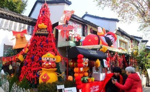 Chinese New Year-themed installments decorate a street in Hangzhou, East China's Zhejiang province.