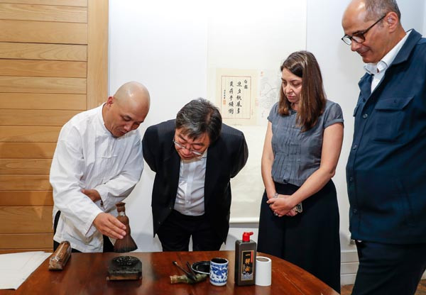 Wei Lizhong (left), curator of Ten Bamboo Studio Art Museum in Hangzhou, demonstrates a Chinese woodblock printing technique to visitors at the London exhibition. [Photo/Xinhua]