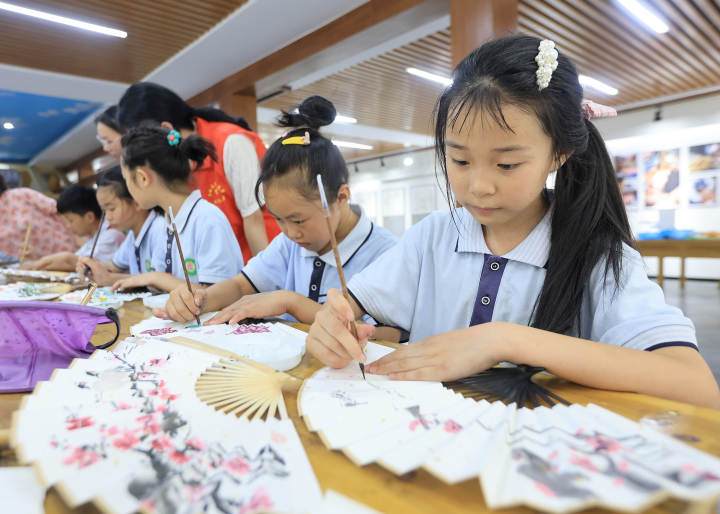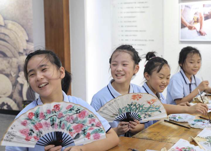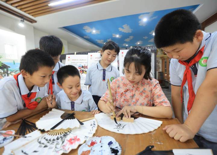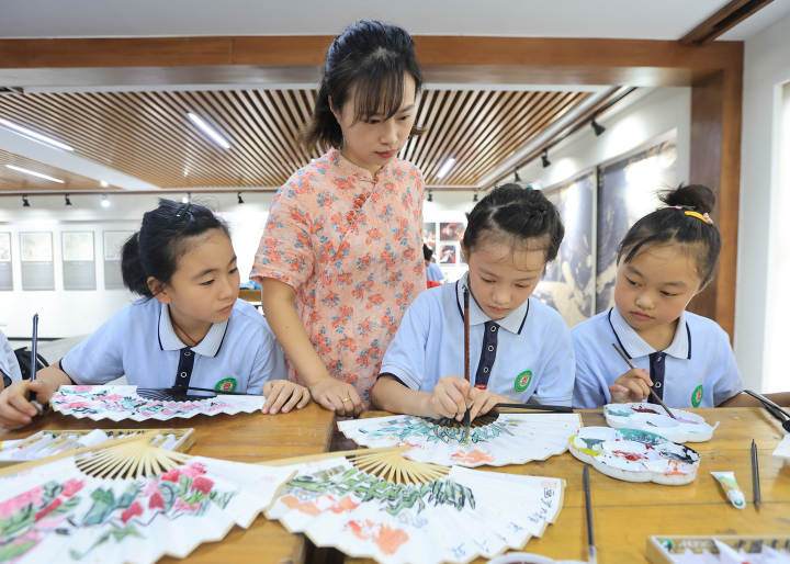 On August 23, in Zhangwu Town, Anji, students of the summer nursery were drawing fan paintings under the guidance of their teachers. Zhang Wu is the former residence of Wu Changshuo. This is also the hometown of fan-making, and fan-related products are exported overseas. The town actively builds a cultural brand of "gifts from Changshuo's hometown" and integrates traditional culture into it. Lead students to understand the production process of traditional folding fans, and feel the unique charm of Chinese fan painting art in the creation.