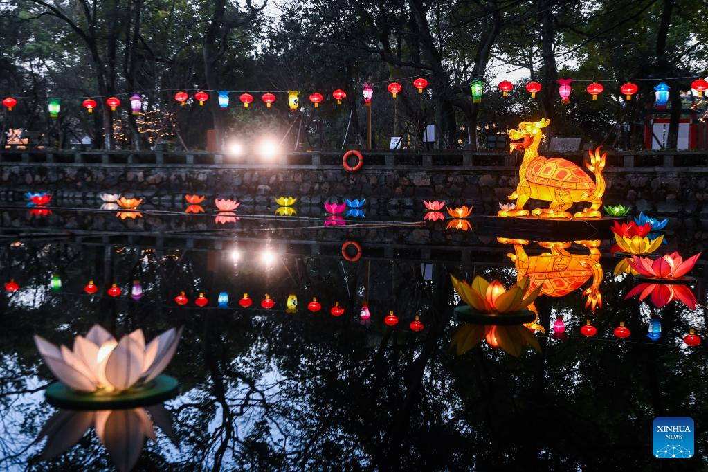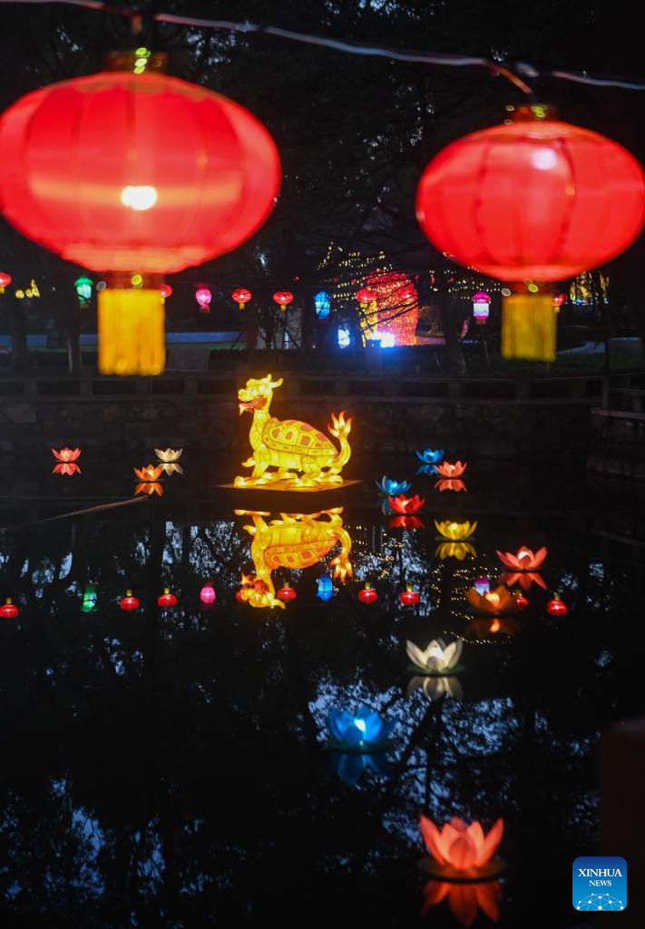 This photo taken on Jan. 29, 2023 shows lanterns at Aoshan Lantern Festival in Xincheng ancient town of Xiuzhou District in Jiaxing, east China's Zhejiang Province. The Aoshan Lantern Festival, which has a history of hundreds of years, kicked off here on Sunday. (Photo/ Xu Yu)