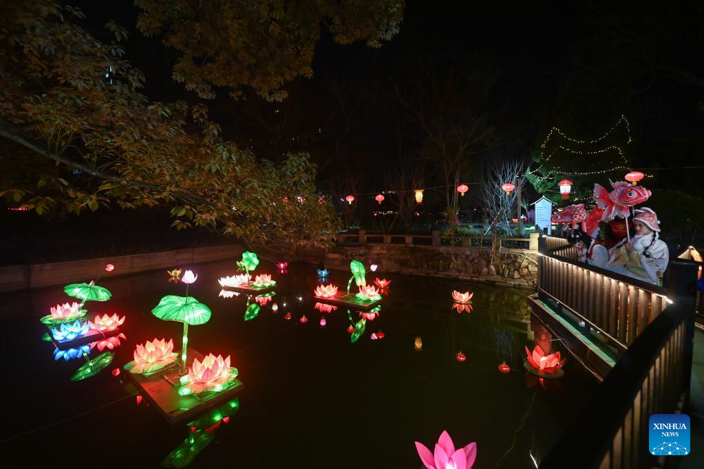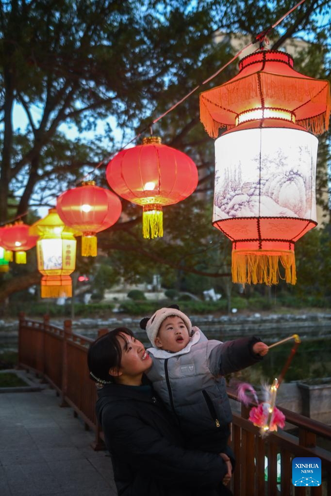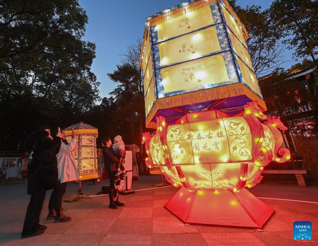 Tourists view lanterns at Aoshan Lantern Festival in Xincheng ancient town of Xiuzhou District in Jiaxing, east China's Zhejiang Province, Jan. 29, 2023. The Aoshan Lantern Festival, which has a history of hundreds of years, kicked off here on Sunday. (Photo/ Xu Yu)