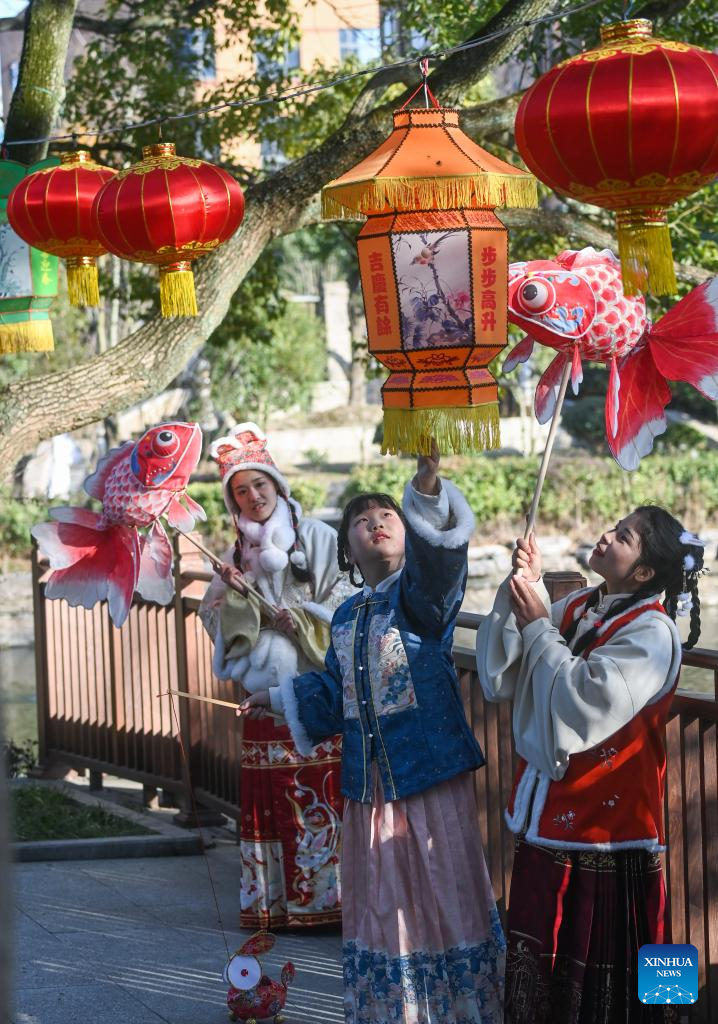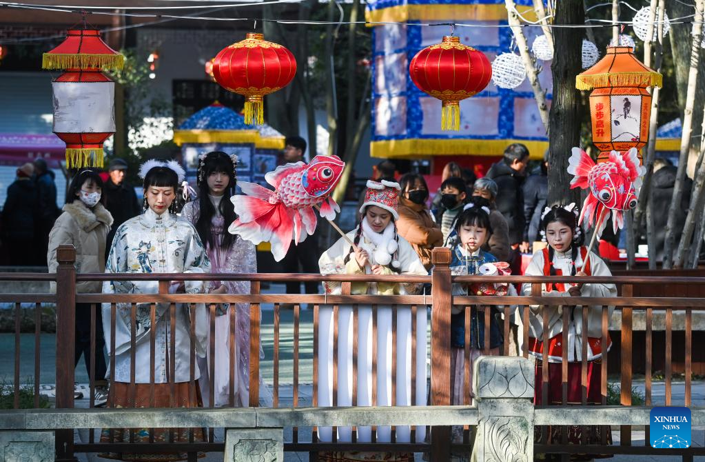 Tourists dressed in traditional Chinese costumes view lanterns at Aoshan Lantern Festival in Xincheng ancient town of Xiuzhou District in Jiaxing, east China's Zhejiang Province, Jan. 29, 2023. The Aoshan Lantern Festival, which has a history of hundreds of years, kicked off here on Sunday. (Photo/ Xu Yu)