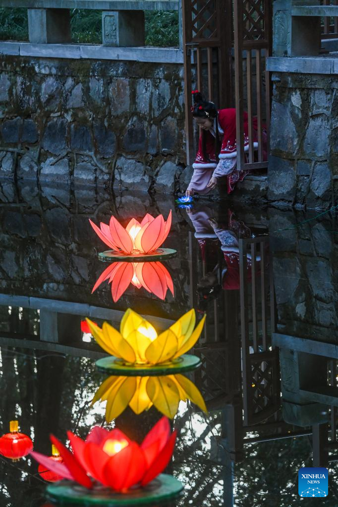 A tourist dressed in traditional Chinese costume releases a water lantern at Aoshan Lantern Festival in Xincheng ancient town of Xiuzhou District in Jiaxing, east China's Zhejiang Province, Jan. 29, 2023. The Aoshan Lantern Festival, which has a history of hundreds of years, kicked off here on Sunday. (Photo/ Xu Yu)