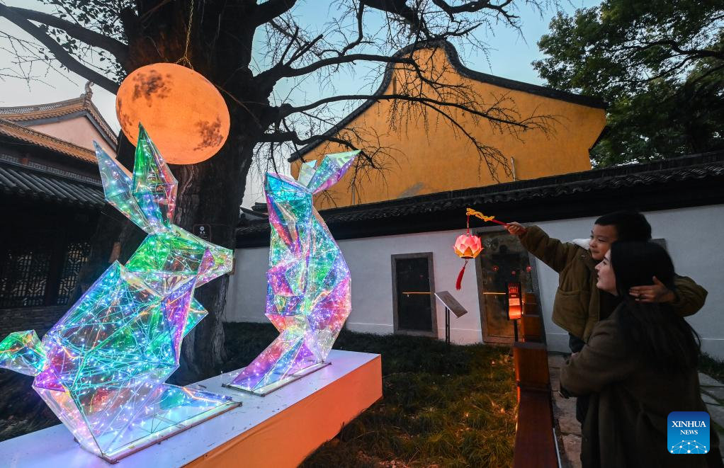 Tourists view rabbit-shaped lanterns at Aoshan Lantern Festival in Xincheng ancient town of Xiuzhou District in Jiaxing, east China's Zhejiang Province, Jan. 29, 2023. The Aoshan Lantern Festival, which has a history of hundreds of years, kicked off here on Sunday. (Photo/ Xu Yu)