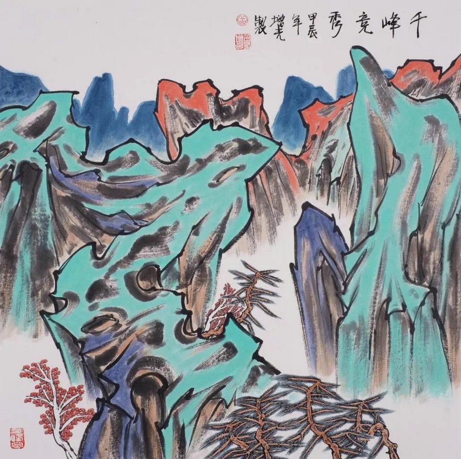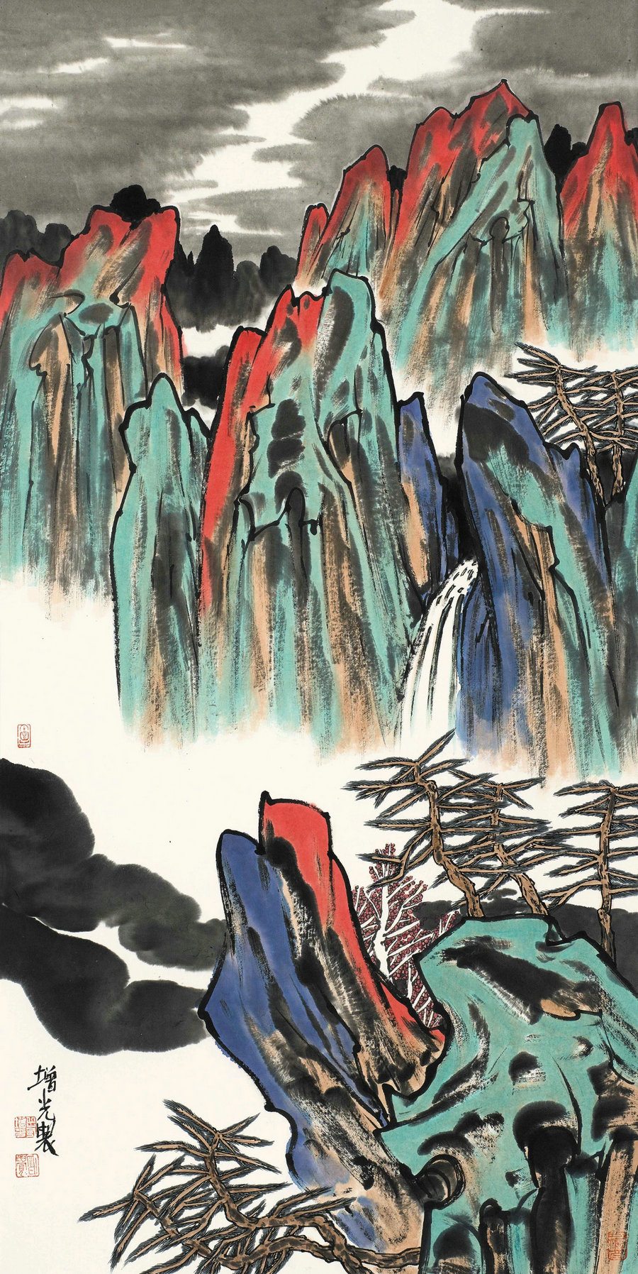 Renowned for his distinctive artistic style, Yue Zengguang infuses vigor and masculinity into the natural elements of mountains, rivers, and trees through sharp outlines in his ink paintings. Contrasting this strength, he expertly incorporates vibrant hues of green, blue, and red with high saturation to imbue his creations with a sense of grandeur and softness.