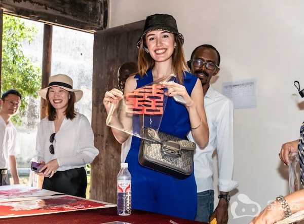Melissa Akeisha holds a xi character paper-cut. [Photo/jinhua.com.cn]