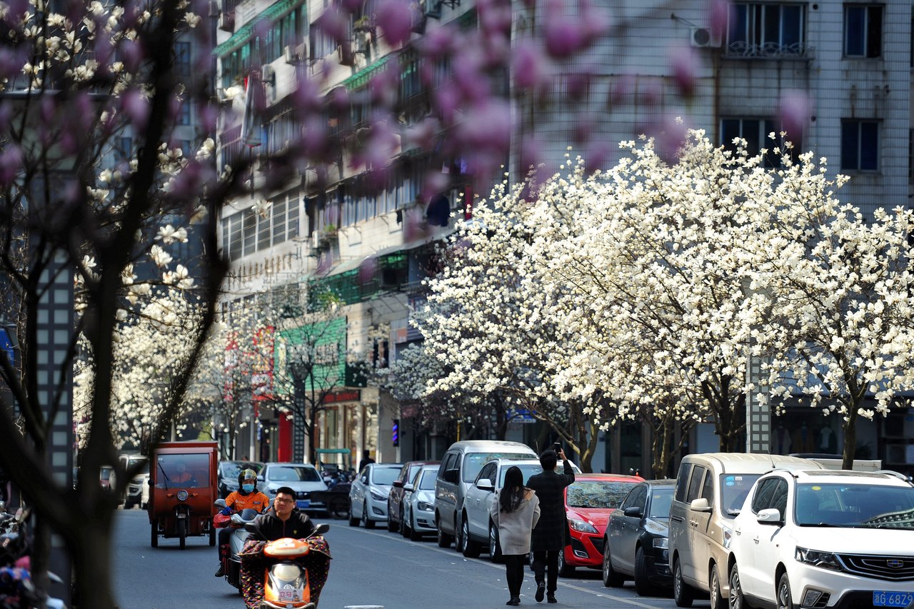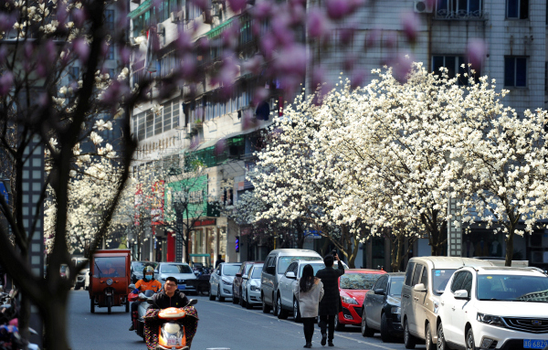 Elegant magnolia flowers glow on the streets in Jinhua