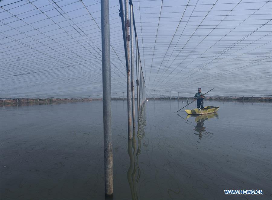 Staff work at a cultivation workshop at the Huwang aquatic fry cultivation base in Baojian Village of Huzhou City, east China's Zhejiang Province, March 24, 2019. More villagers have started to work in freshwater aquaculture industry since 2014. Over 600 mu (40 hectare) fishing ponds were built by the Huwang aquatic fry cultivation base in Baojian Village, with the annual output of fish fry reaching about one billion. In the end of March, the fry cultivation industry enters into the peak selling season. (Xinhua)