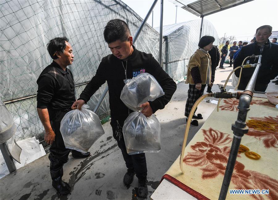 A fish farmer buys three bags of bass fry at the Huwang aquatic fry cultivation base in Baojian Village of Huzhou City, east China's Zhejiang Province, March 24, 2019. More villagers have started to work in freshwater aquaculture industry since 2014. Over 600 mu (40 hectare) fishing ponds were built by the Huwang aquatic fry cultivation base in Baojian Village, with the annual output of fish fry reaching about one billion. In the end of March, the fry cultivation industry enters into the peak selling season. (Xinhua)