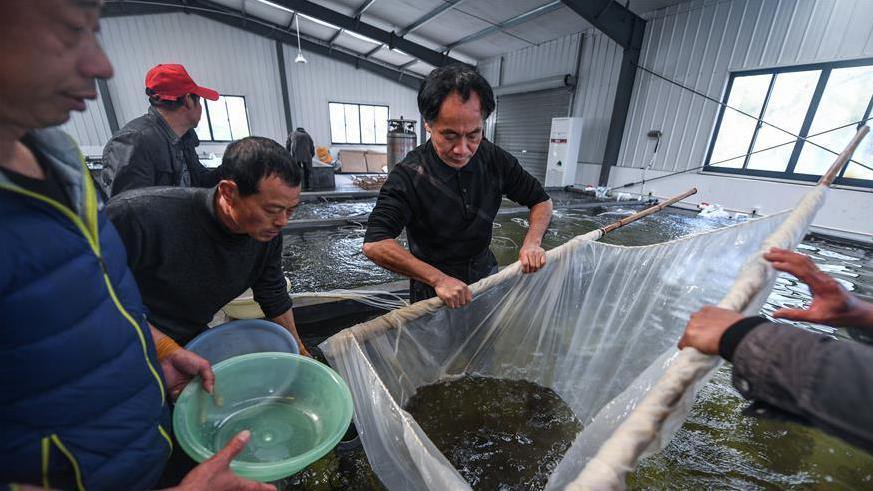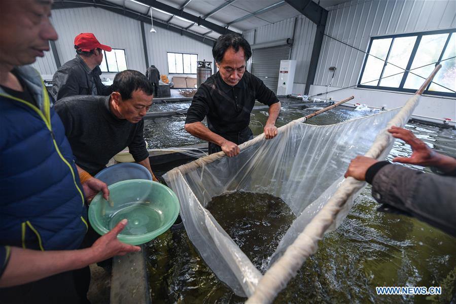 Workers catch fry for sale at a workshop at the Huwang aquatic fry cultivation base in Baojian Village of Huzhou City, east China's Zhejiang Province, March 24, 2019. More villagers have started to work in freshwater aquaculture industry since 2014. Over 600 mu (40 hectare) fishing ponds were built by the Huwang aquatic fry cultivation base in Baojian Village, with the annual output of fish fry reaching about one billion. In the end of March, the fry cultivation industry enters into the peak selling season. (Xinhua)