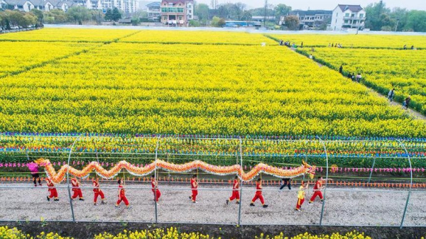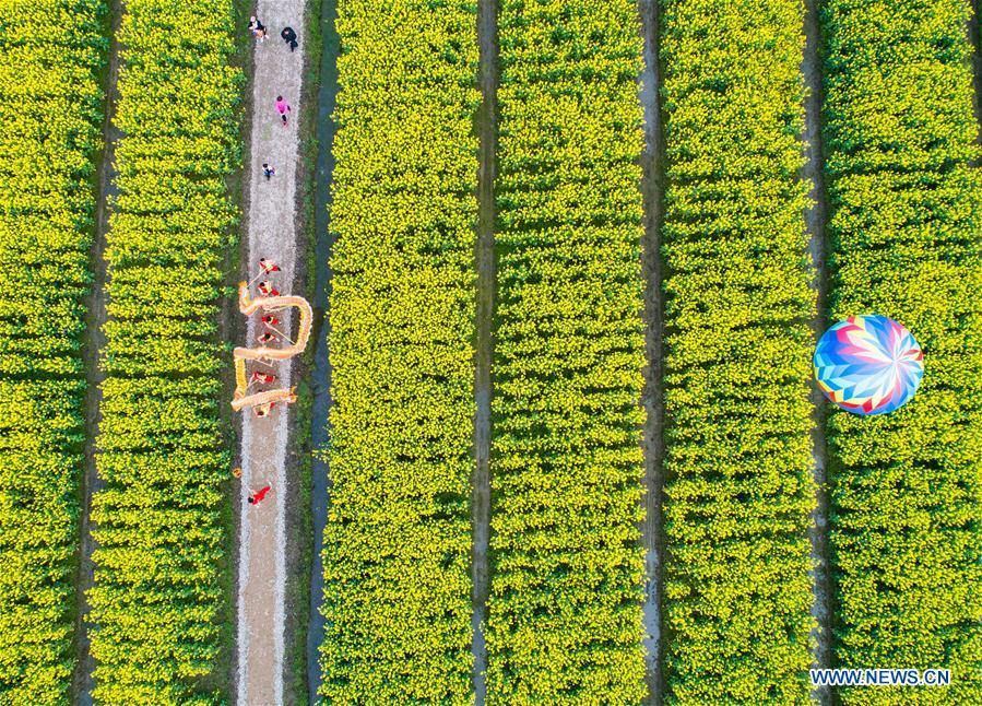 Aerial photo shows villagers performing dragon dance among cole flower fields at an ecological scenic spot in Huzhou City, east China's Zhejiang Province, March 30, 2019. A cole flower tourism festival kicked off here on Saturday. (Xinhua/Xu Yu)