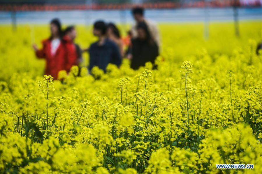 People visit cole flower fields at an ecological scenic spot in Huzhou City, east China's Zhejiang Province, March 30, 2019. A cole flower tourism festival kicked off here on Saturday. (Xinhua/Xu Yu)