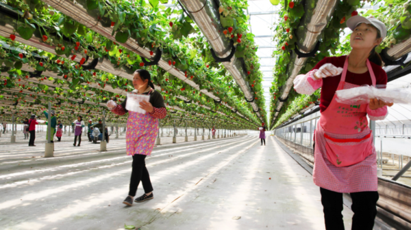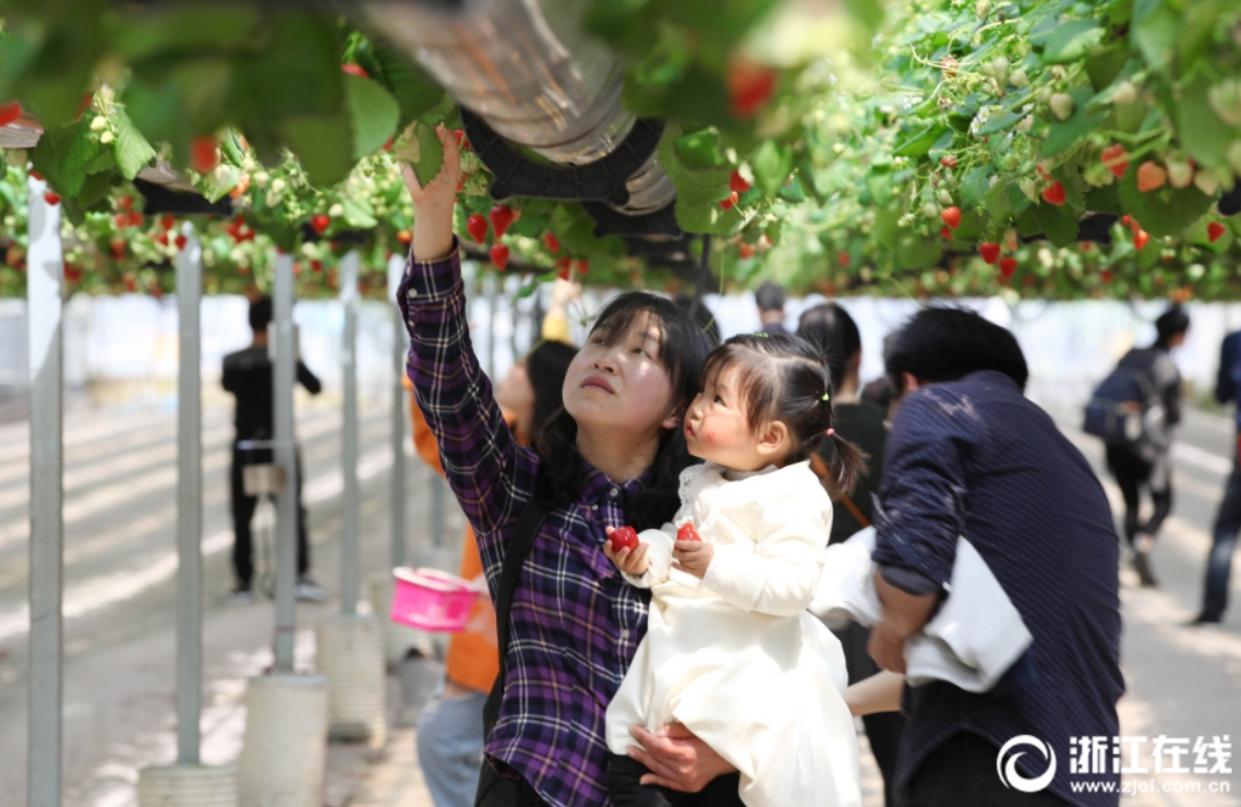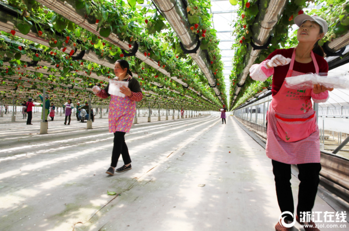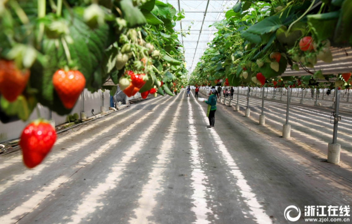 Photos show the elevated strawberry beds at the base of an agro-industrial company in Taizhou City, Zhejiang Province. Elevated strawberries stay warmer than strawberries in the ground, which means a relatively longer season, from November through April. The plants grow downward, making the berries easy to harvest. Their initial costs are higher than the normal ones. (Photo/ Liu Zhenqing)