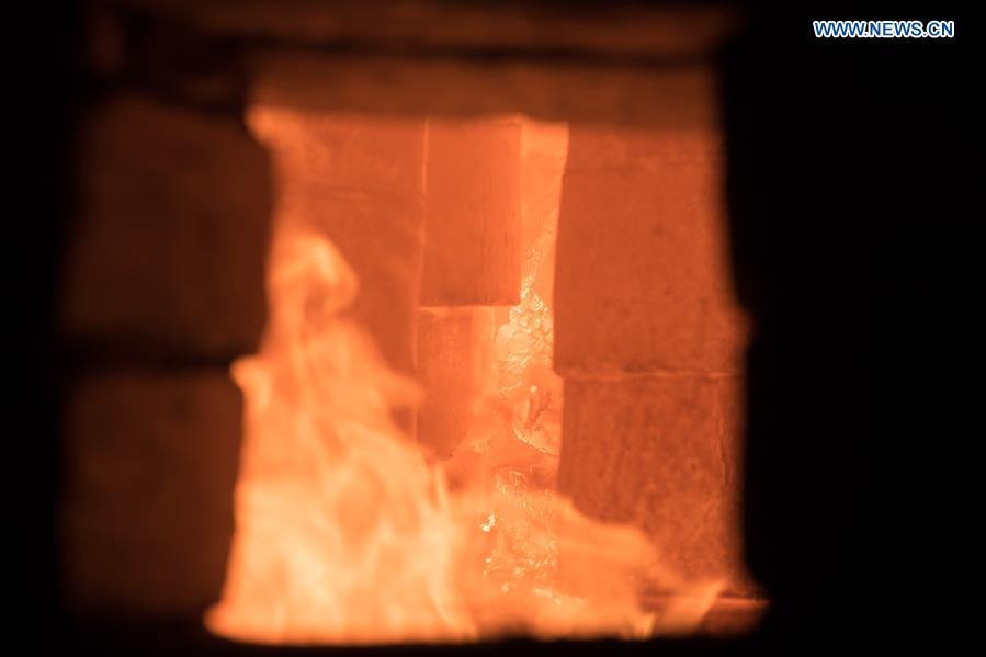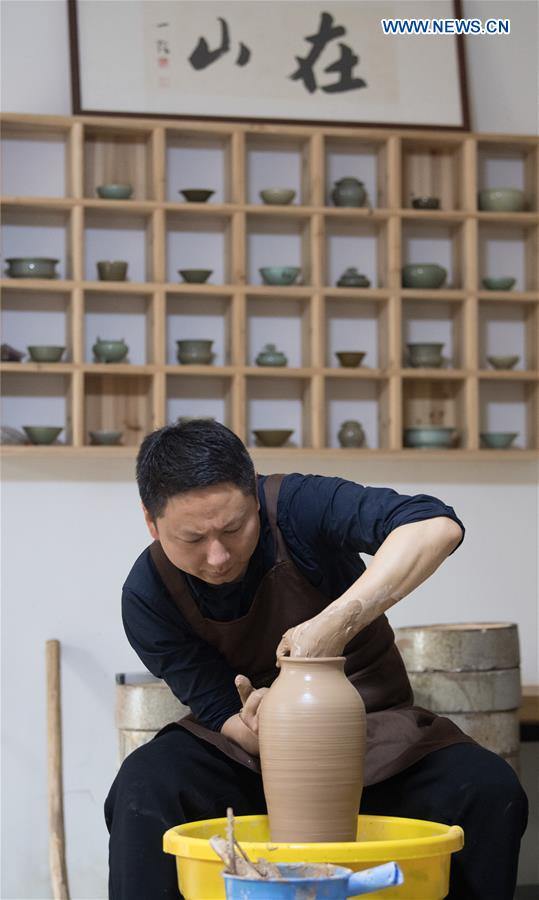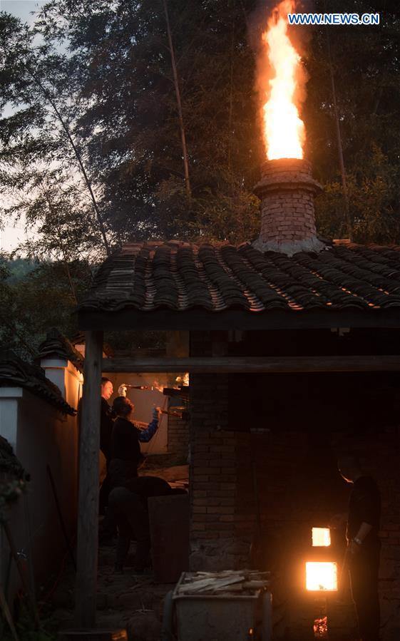 Liu Jie, born in 1985, is a celadon maker in Longquan City of Zhejiang Province. In 2016, he closed his studio and moved to a mountain with his family in the southern suburb of Longquan, where he built a kiln for Longquan celadon and researched on the traditional making of celadon. Liu follows the traditional way of celadon making of the Song Dynasty (960-1279) and does all the procedures personally. His kiln works four or five times a year, and during each time he has to add firewood for continuous ten plus hours and cool down the kiln naturally for two days. (Xinhua/Weng Xinyang)