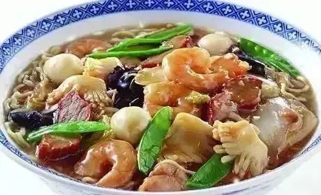 It is a local delicacy of the Han nationality in Linhai City, Zhejiang Province. The noodle is shaped into shrimps with flour and has a unique flavor with rich toppings.