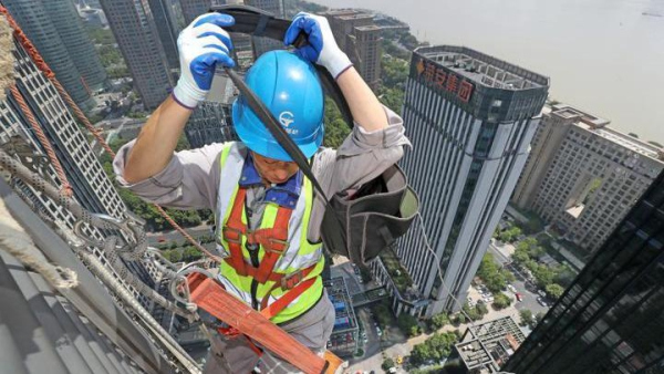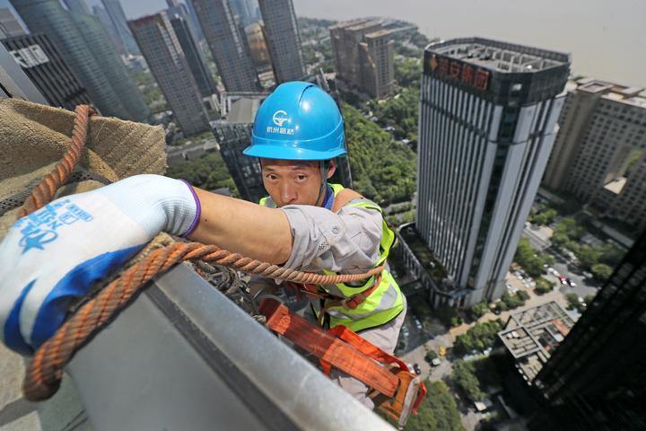 At 10 o'clock in the morning on August 18, the hot sun high in the sky, on the 36th floor of Hangzhou Qiantang Aviation Edifice, at an altitude of 120 meters, Wang Xuyang sat on a wooden board with two ropes tied around his waist and climbed down.