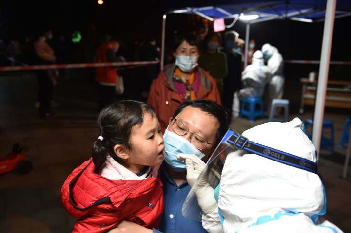 On the evening of March 14, residents of the Shengyuan Residential Community in Hangzhou were lining up for nucleic acid tests. (Photo/Pan Haisong)