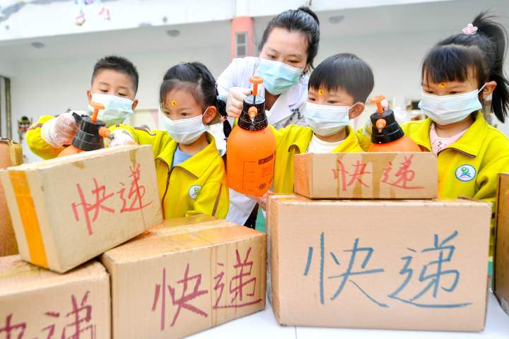 Changxing County popularizes the knowledge of protecting themselves from being infected by COVID-19 during unpacking the boxes to children on campus (Photo/Tan Yunfeng)