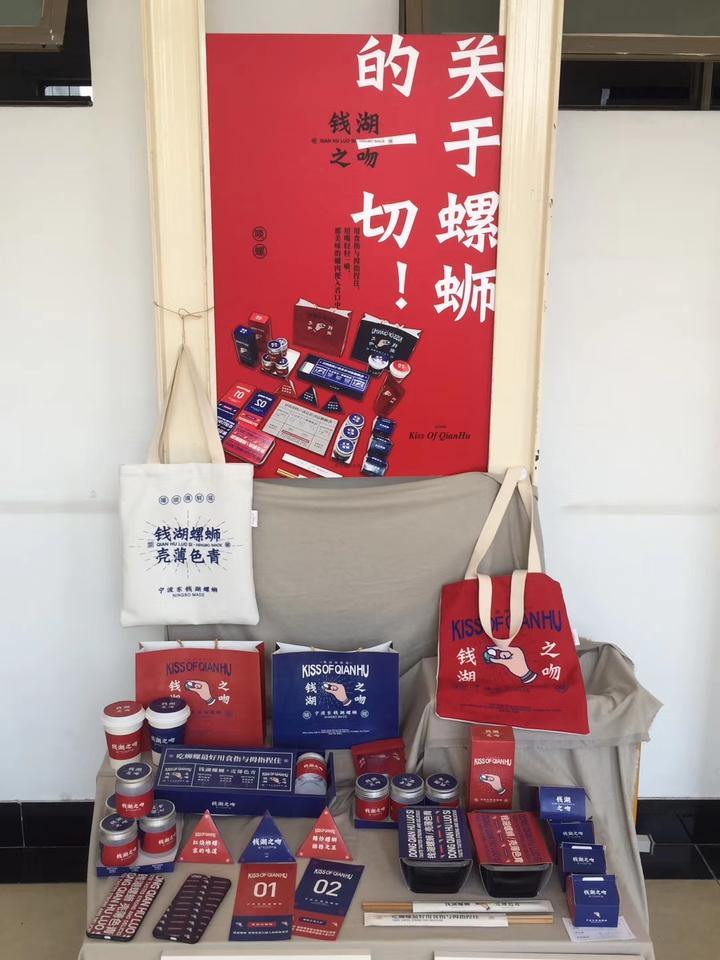 The “Kiss of Dongqian Lake” series designed by Jiangze Mei and Chunyi Zhang was inspired by “spiral shells,” one of the four treasures of Dongqian Lake. “When eating spiral shells, pinch a spiral shell between thumb and index finger, suck it lightly. This eating move inspired our design, so we named our design Kiss of Dongqian Lake.” After several times of discussing and organizing, they decided to adopt Chinese and English elements on the package of products such as lunch box, chopsticks, and canvas bag, of which Chinese characters were in a traditional script, and English words were in bold and sans-serif font and the logo illustration was the hand’s movement of pinching a spiral shell. “We want to infuse elements of nostalgia and fashion into our works, meet today’s young customers’ aesthetic taste with strong local characteristics and Chinese style.”