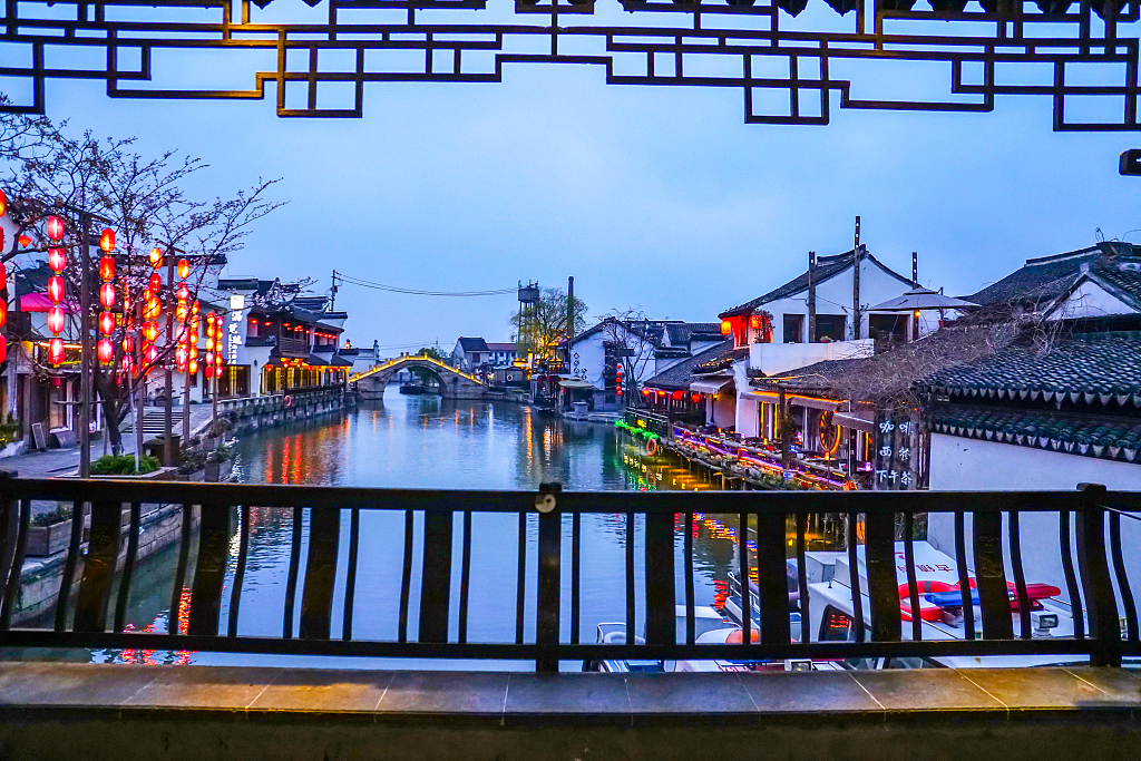 In the evening, the lamps in Xitang Ancient Town lighten up the night. /VCG Photo