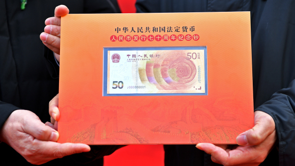 Photo taken on Dec. 28, 2018 shows the No. J000000001 commemorative banknote of the Chinese currency renminbi during a ceremony in Shijiazhuang, north China's Hebei Province. (Xinhua/Li Xin)