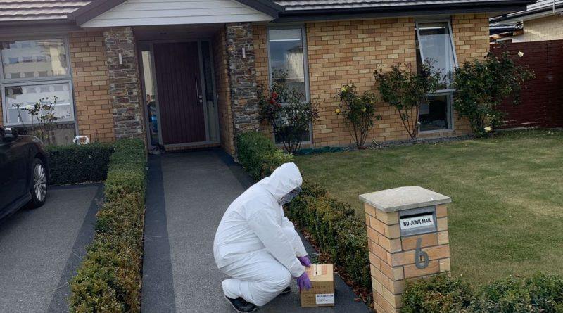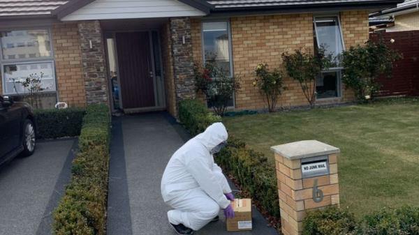 在新西兰南岛最大城市克赖斯特彻奇(基督城),外卖配送员张一鸥穿着防护服、戴着护目镜和手套,来到订餐客户家门口。他把一盒熟食放在门外,用短信通知客户,完成一次“无接触配送”。