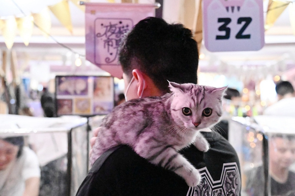 A man walks at a night market with his cat on his shoulder in Zhengzhou, Henan province, on July 30, 2020. (Photo via Xinhua)