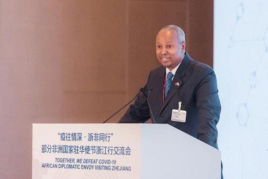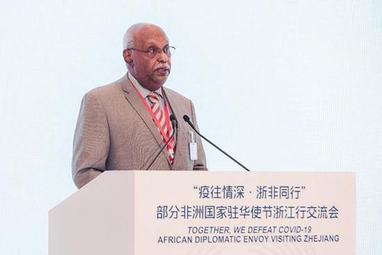 Abdallah Abdillahi Miguil, Djibouti's ambassador to China, delivered a speech on behalf of the group of African envoys. Miguil said that this year marks the 20th anniversary of the establishment of the Forum on China-Africa Cooperation (FOCAC) and that China-Africa cooperation has been presented with both opportunities and challenges amid the pandemic. Miguil expressed hope for a stronger friendship between Zhejiang and Africa.