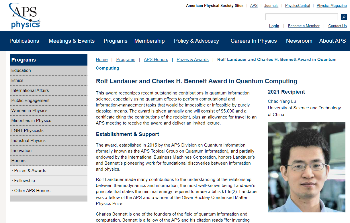 (Professor Lu has received the 2021 Rolf Landauer and Charles H. Bennett Award in Quantum Computing, screenshot from APS)