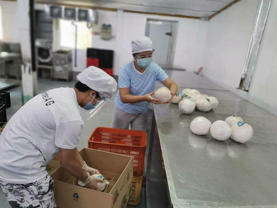 Workers box processed coconuts in Davao, southern Philippines, Aug. 26, 2020. (Xinhua)