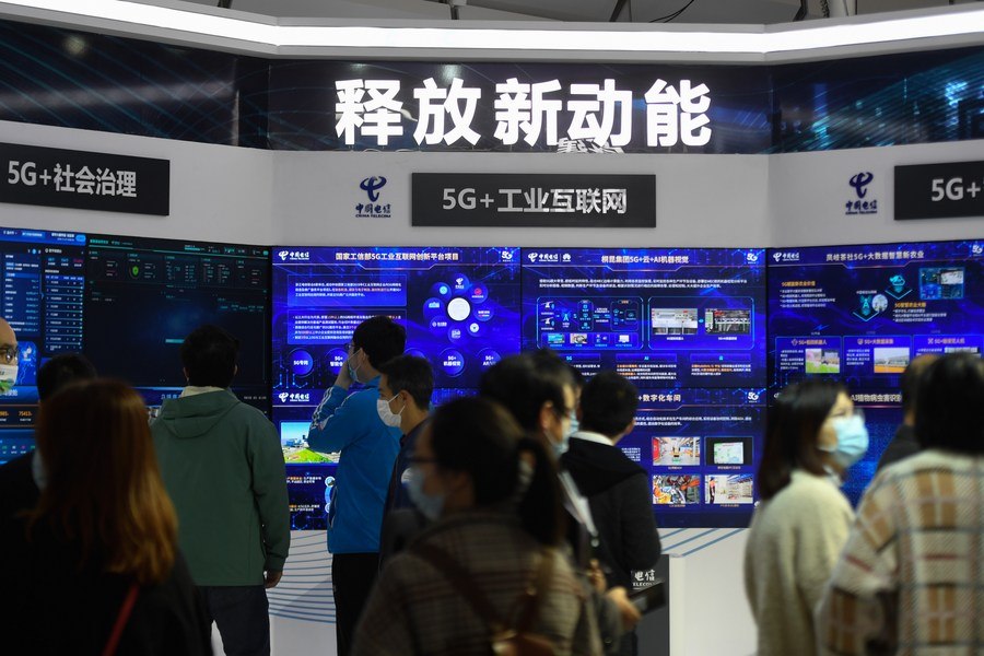 People learn about 5G technology at the booth of China Telecom during the Light of Internet Expo of the 2020 World Internet Conference (WIC) in Wuzhen, east China's Zhejiang Province, Nov. 22, 2020. (Xinhua/Huang Zongzhi)