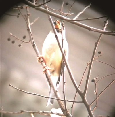 Zhang pays special attention to different sounds. Today he has good luck for he hears the special crisp "squeak hey, squeak hey" birdsong, it seems to be the community's "new guests." He set up a bird-watching mirror, adjusted his mobile phone, and photographed a round-shaped bird with gray-brown feathers, a blackhead pointed tailed, and yellowmouth, with the scientific name Eophona personata.