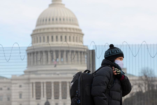 A man wearing a face mask walks past the U.S. Capitol building in Washington, D.C., the United States, Jan. 24, 2021.(Photo by Aaron Schwartz/Xinhua)