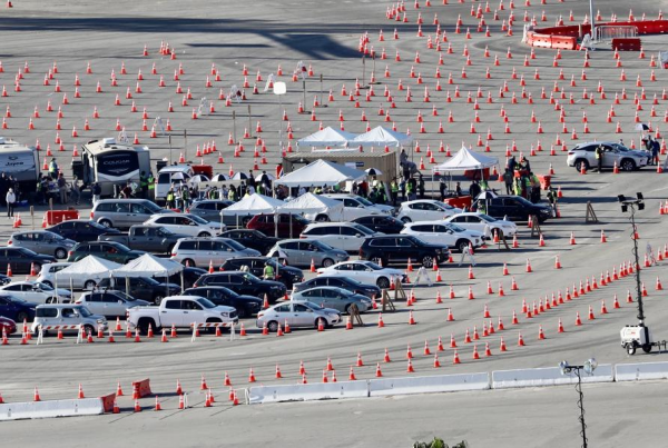 Motorists line up to receive inoculation at a COVID-19 vaccination site at Dodger Stadium in Los Angeles, California, the United States, on Jan. 15, 2021. (Xinhua)