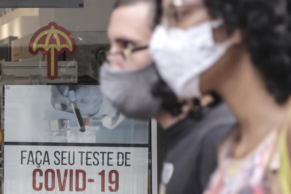 People pass by a COVID-19 test poster in Sao Paulo, Brazil, Jan. 22, 2021. (Xinhua/Rahel Patrasso)