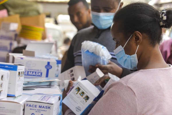 A woman selects face masks at an open-air market in Addis Ababa, Ethiopia, on Jan. 9, 2021. (Xinhua/Michael Tewelde)