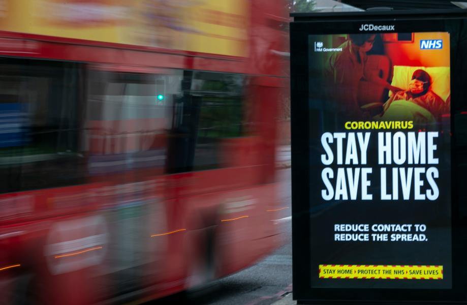 A bus runs past an advertising board reading "Stay Home Save Lives" in London, Britain, Jan. 10, 2021.(Xinhua/Han Yan)