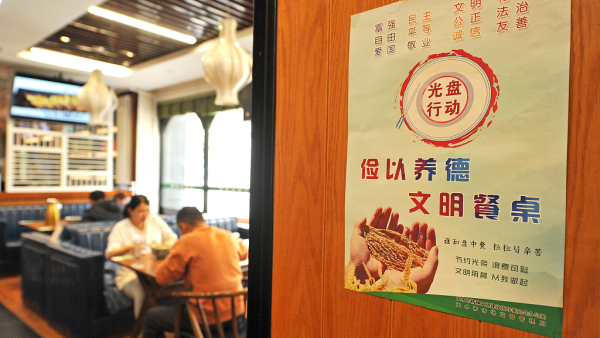 A poster is displayed at a restaurant, urging diners to save food, in Tianshui City, Gansu Province, northwest China, September 22, 2020. /CFP