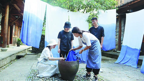 Tourists learn about traditional cloth dyeing techniques in Wuyantou village, Taizhou, Zhejiang. [Photo/China Daily]