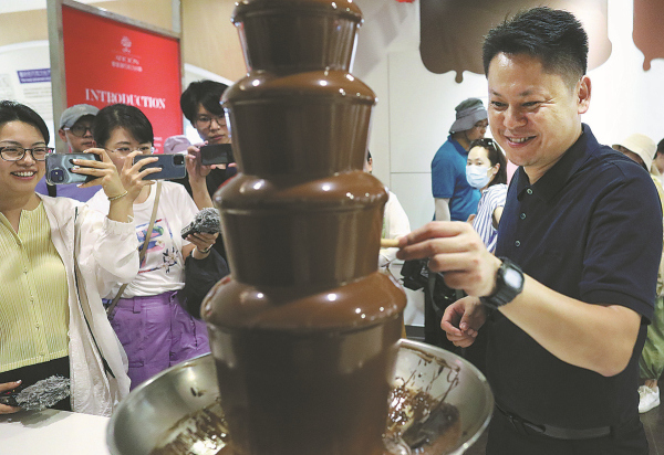Mo Xuefeng (right), general manager of Zhejiang Jiashan Chocolate Sweet Town, demonstrates a chocolate waterfall to visitors. [Photo by Zhu Xingxin/China Daily]