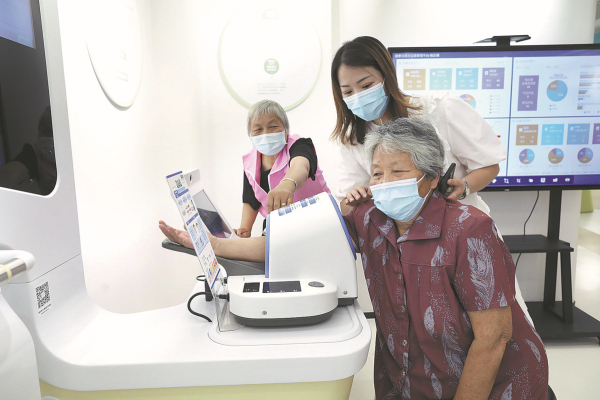 A resident of Yaozhuang town, Jiashan county, Zhejiang, has her blood pressure checked at the local health center. [Photo by Zhu Xingxin/China Daily]