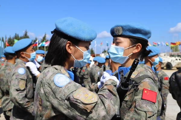 Soldiers on the Chinese contingent to the United Nations Interim Force in Lebanon (UNIFIL) are awarded the United Nations Peacekeeping Medal during a medal parade ceremony in southern Lebanon, June 16, 2021. (Photo by Liu Xiongma/Xinhua)