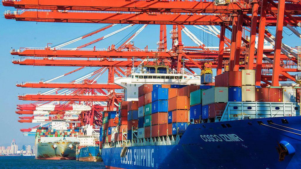 Containers carrying goods for export are seen in Qingdao Port, East China's Shandong province. (Photo/VCG)