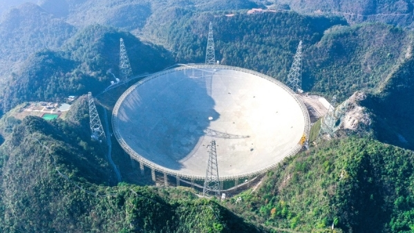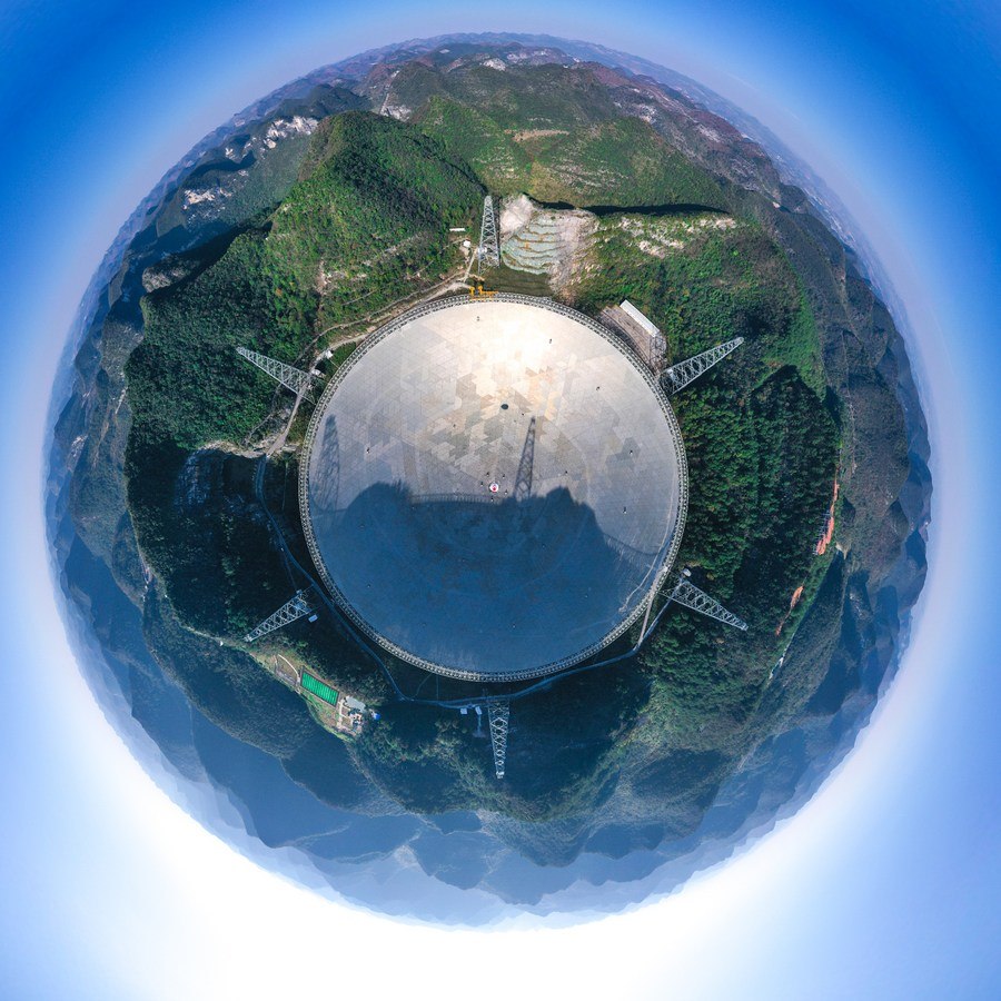 Aerial photo taken on Dec. 19, 2021 shows a panoramic view of China's Five-hundred-meter Aperture Spherical Radio Telescope (FAST) under maintenance in southwest China's Guizhou Province (Xinhua/Ou Dongqu)