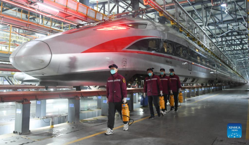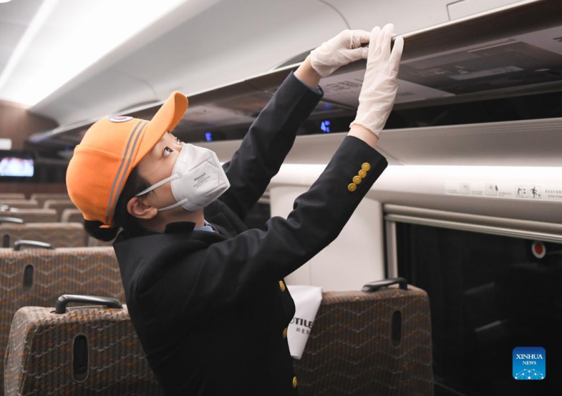 A staff member carries out a hygienic check on a train in Wuhan, central China's Hubei Province, Jan. 16, 2022. The number of railway passenger trips during China's upcoming Spring Festival travel rush is expected to jump 28.5 percent from the holiday season last year, industry data shows. During the 40-day travel season, also known as chunyun, many Chinese people will travel to meet their families for the Chinese Lunar New Year, or Spring Festival, which will fall on Feb. 1, 2022.