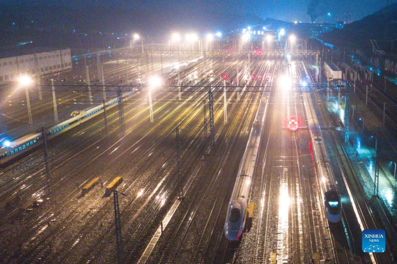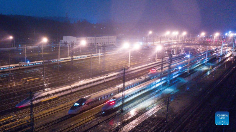 Aerial photo taken on Jan. 16, 2022 shows bullet trains at a train depot in Guiyang, southwest China's Guizhou Province. The number of railway passenger trips during China's upcoming Spring Festival travel rush is expected to jump 28.5 percent from the holiday season last year, industry data shows. During the 40-day travel season, also known as chunyun, many Chinese people will travel to meet their families for the Chinese Lunar New Year, or Spring Festival, which will fall on Feb. 1, 2022.