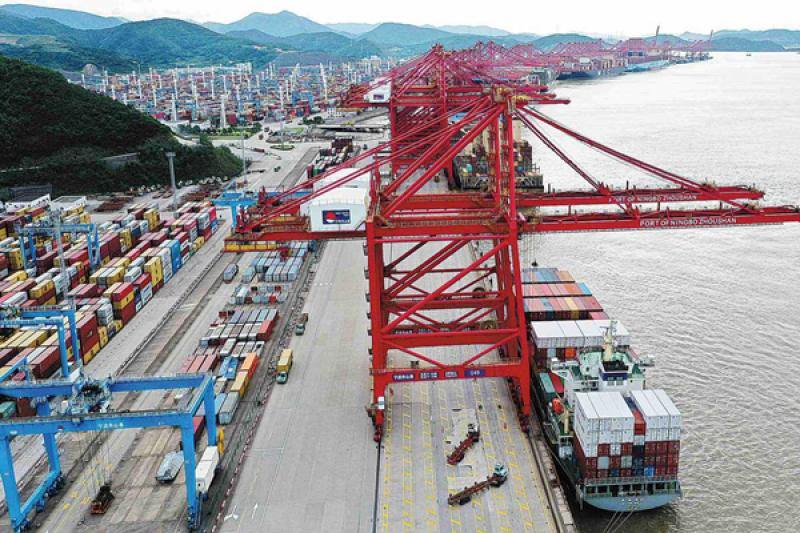 A container liner prepares to depart Ningbo Zhoushan Port, Zhejiang province, on Sept 5, 2021. (Photo by Yao Feng/For China Daily)